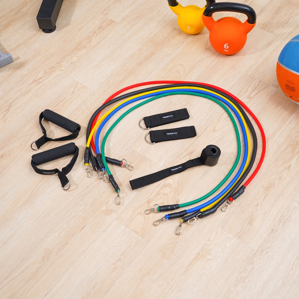 Using the Kinetic Power Resistance Band Gym, which features five different resistance levels and three handle variations, you can perform bicep curls, lateral raises, or squats to tone your leg muscles. It is durable and easy to pack back into its pouch after your family workout session.