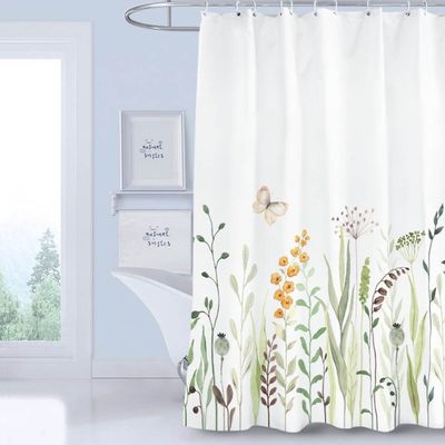 Enjoy a relaxing atmosphere in your bathroom with the Botanical-themed shower curtain shown above. A combination of butterflies and grass with natural color tones creates a calming mood, making your shower experience even more refreshing. The Botanical design is also unique and different from the Tropical Leaves pattern, featuring butterflies scattered at the top and lush grass filling the bottom for a fresh and natural feel.\