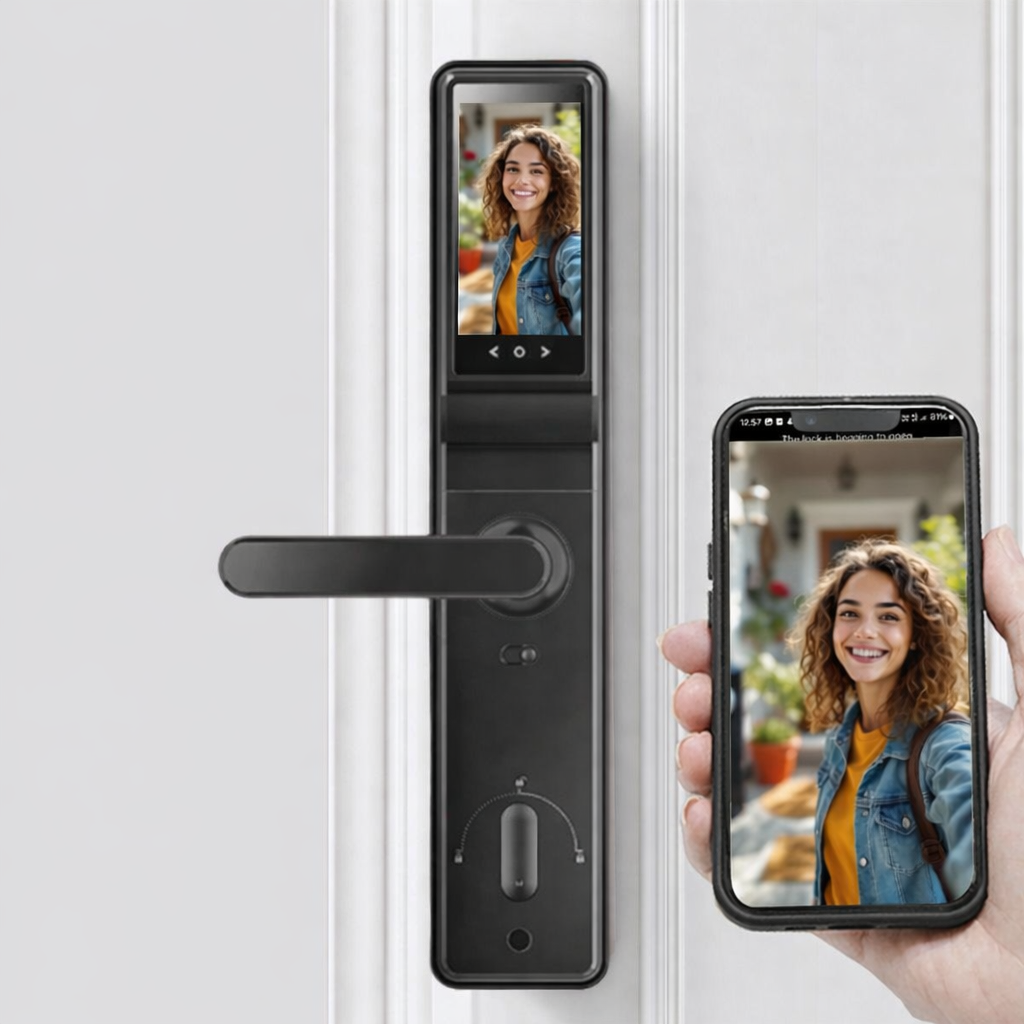 Bahkan doorlock ini dilengkapi kamera, jadi kamu bisa melihat siapa yang sedang berada di depan pintu kamu. Wajahnya bisa kamu lihat langsung dari smartphone melalui aplikasi SYNC. Sudah dilengkapi dengan door bell, dan dapat dipasang pada pintu kayu, besi, aluminium, dan uPVC.