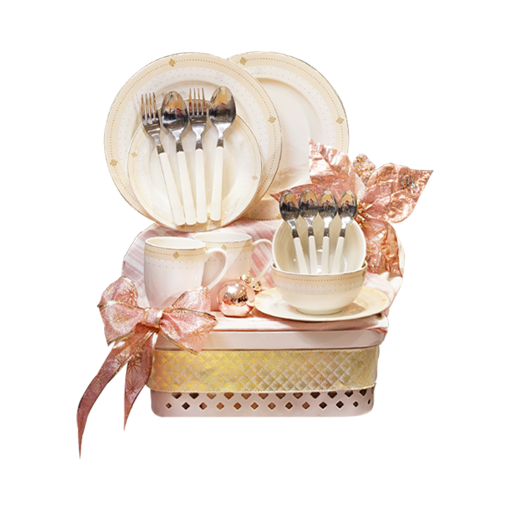 Hampers Wonderful Bloom, cocok banget buat kamu yang lagi mau memberikan hampers dengan kesan elegan dan berkelas berisi piring dan gelas cantik. Hampers ini selain tampilannya yang menarik, isinya juga dapat digunakan sebagai perlengkapan rumah tangga dari brand Delicia dan Stora. Isi utamanya terdiri dari perlengkapan makan, berisi: