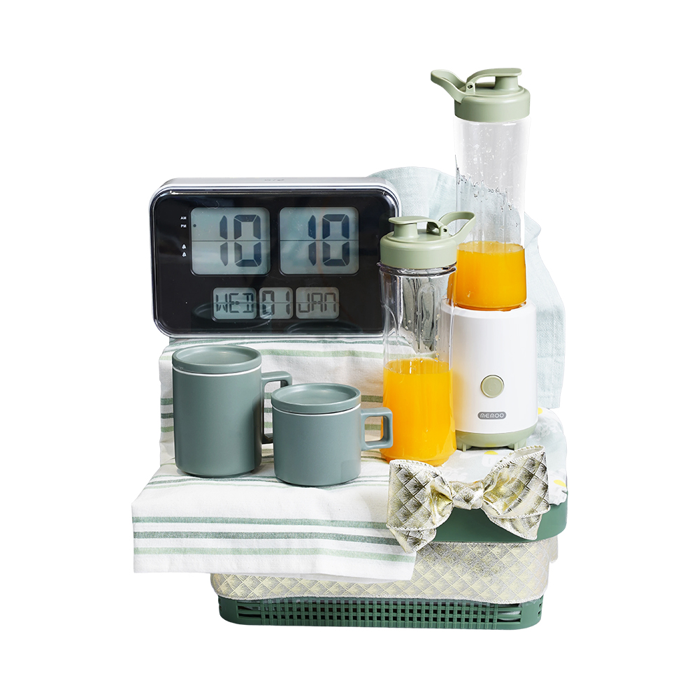Hampers Jingle Oclock, cocok banget buat diberikan kepada keluarga atau teman yang lagi mau mulai hidup sehat, terutama mereka yang suka mengonsumsi jus segar. Karena hampers ini sudah spesifik dirancang khusus untuk memudahkan kerabat kamu untuk menikmati jus setiap hari di rumah aja! Hampers ini terdiri dari: