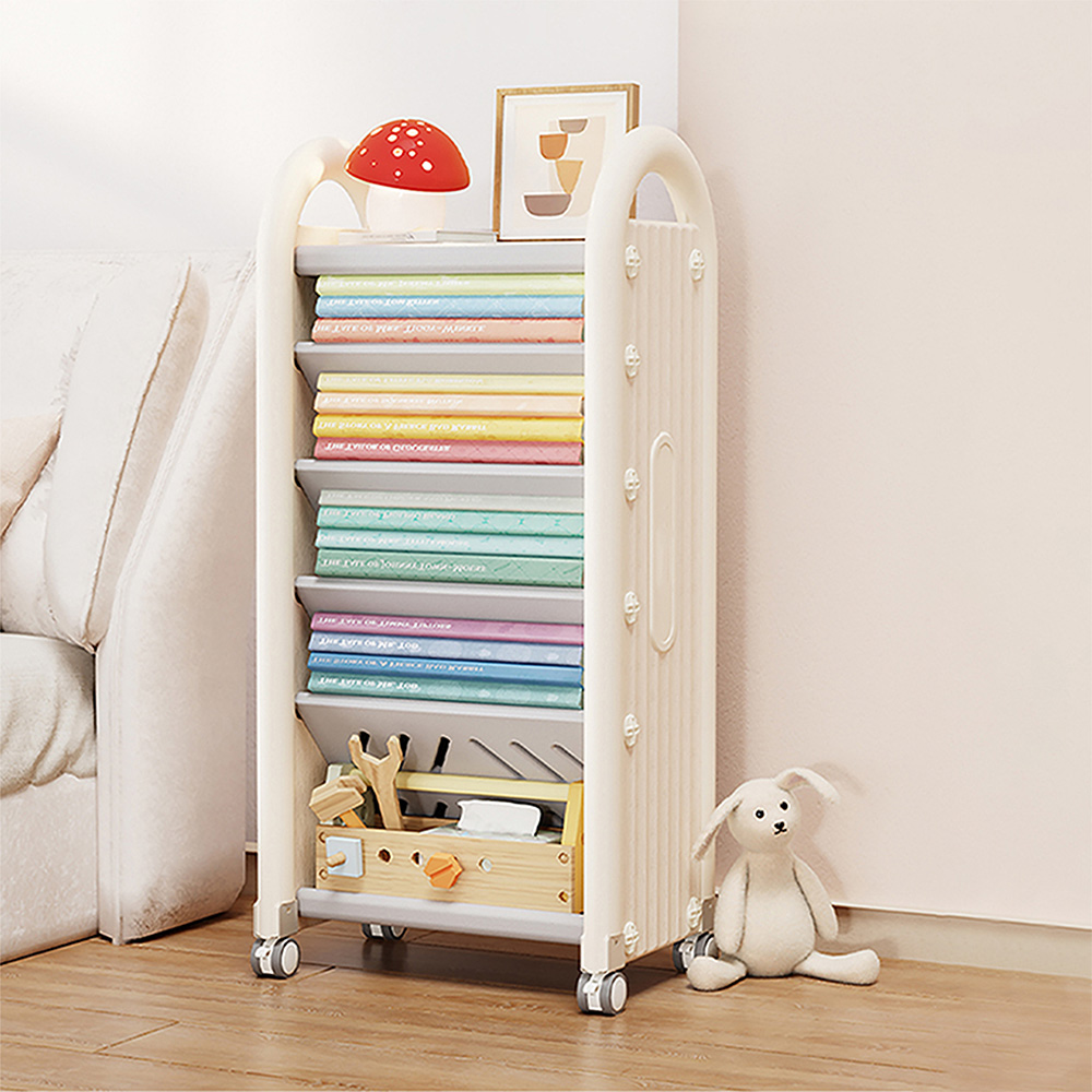 Rak buku ini memiliki kapasitas penyimpanan yang besar dengan lima kompartemen, cocok untuk menyimpan berbagai macam buku hingga alat tulis anak. Sudah dilengkapi juga dengan roda 360 derajat jadi mudah dipindahkan ke mana saja.
