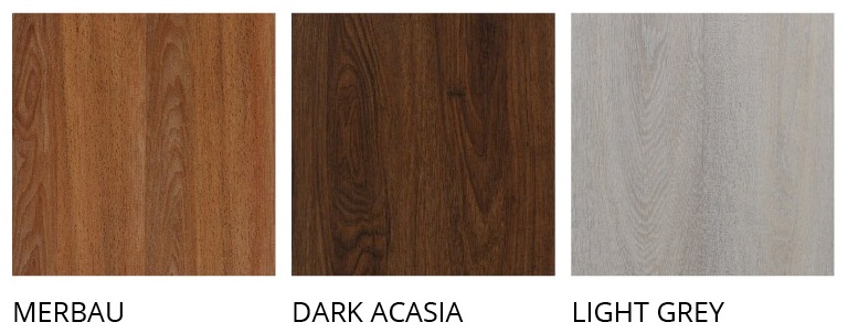 Available in three design/color options: Merbau, Dark Acacia, and Light Grey. Each box contains 8 planks with an area of 1.75 m² per box.