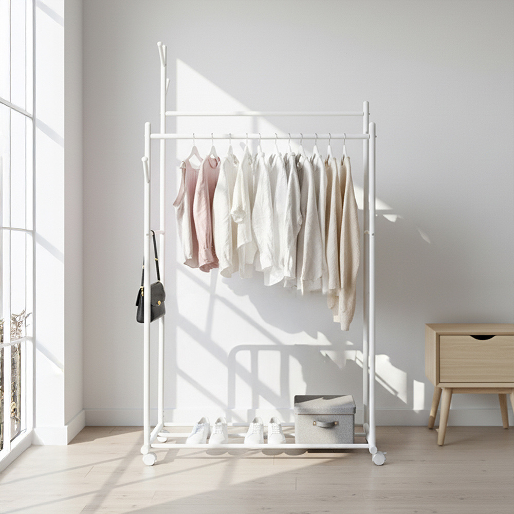 Agar pakaian baru tetap tersimpan rapi dan siap dikenakan, penyimpanan yang tepat juga tak kalah penting. Menggunakan Stora Alba Gantungan Pakaian Double dengan Pengait memberikan solusi penyimpanan pakaian yang praktis dan mudah dipindahkan berkat roda yang terpasang. Rangka yang kokoh dengan finishing powder coating, dilengkapi rak bawah untuk menyimpan sepatu serta pengait tambahan untuk menggantung aksesori agar tetap terorganisir. Desain yang simpel dan elegan ini, tentunya tidak akan menyulitkanmu saat merakit. Menggunakan ini, tidak lagi perlu takut baju menumpuk setelah berbelanja untuk perayaan Imlek.
