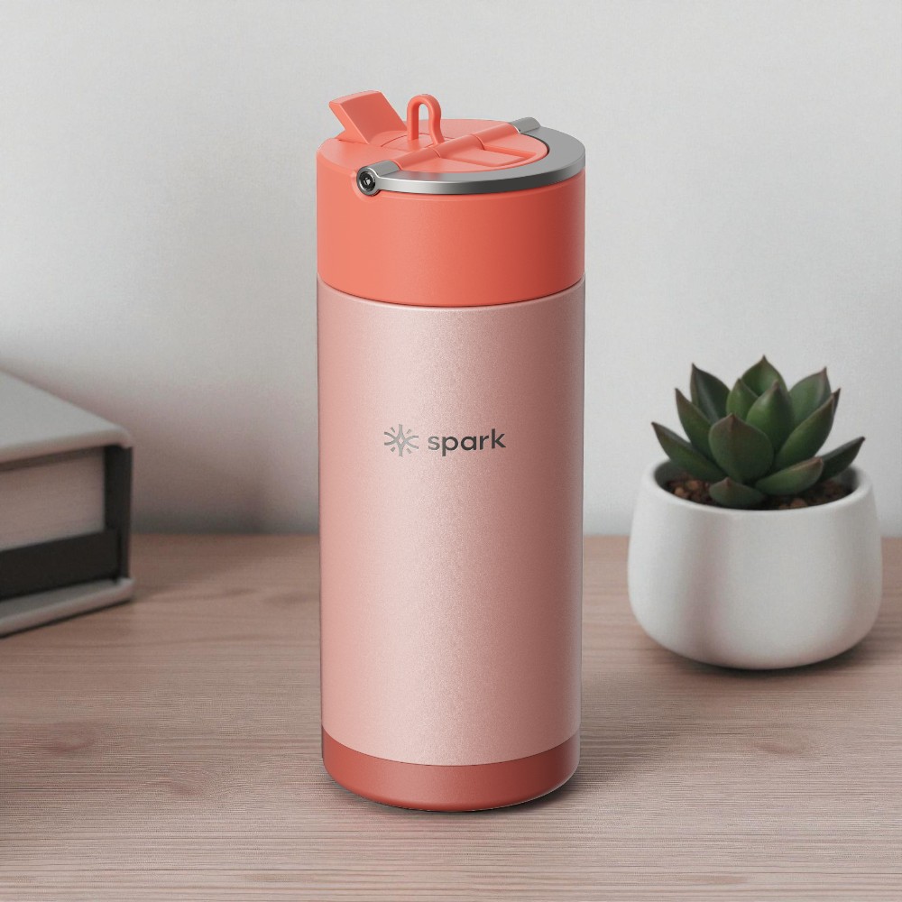 This Spark Flicksip Stainless Steel Vacuum Flask is perfect for you! This tumbler is designed to retain heat for up to 9 hours and cold for up to 12 hours. The material is stainless steel, ensuring it is safe and durable, with a 480 ml capacity and various color options: pink, blue, black, and purple.