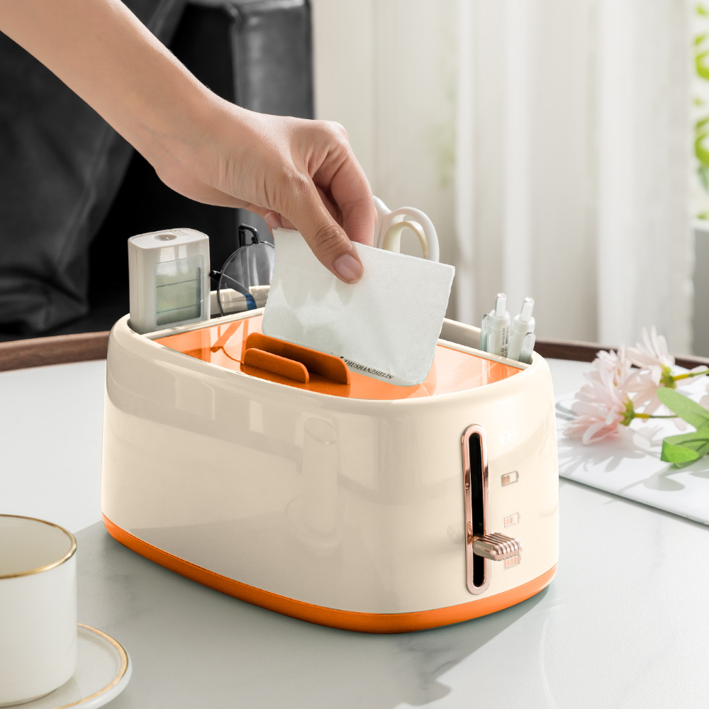 Selain desainnya yang unik menyerupai pemanggang roti (toaster), kotak tisu ini juga sudah didesain agar praktis dan mudah digunakan karena pada bagian dalamnya sudah terdapat pegas spiral sehingga memudahkan pengambilan tisu.