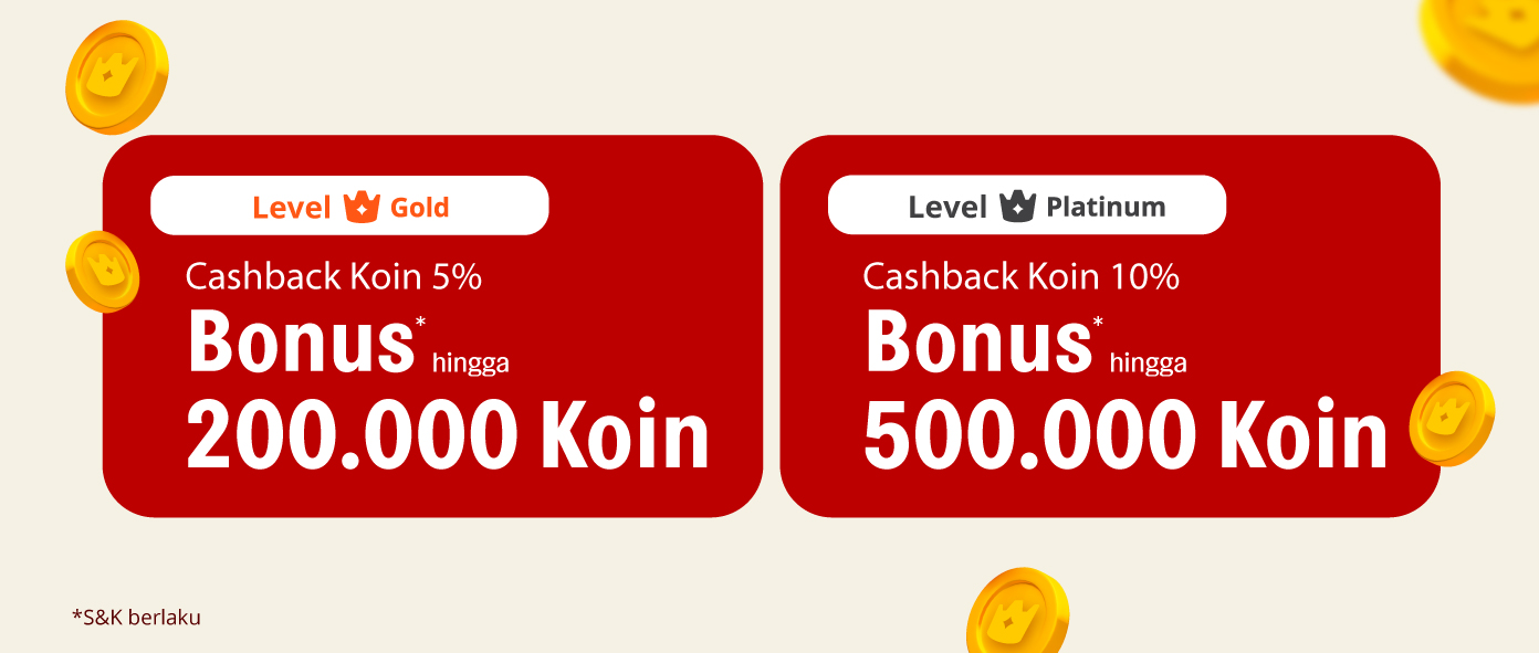 • Level Gold, minimal belanja Rp1 juta dapat Cashback Koin 5% maks. 200,000 Koin
