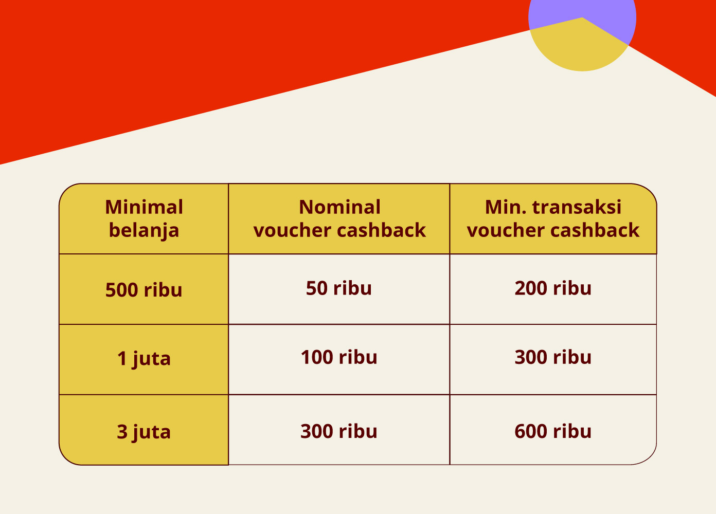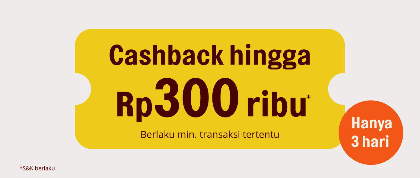 Dapatkan cashback hingga Rp300ribu untuk minimal belanja mulai dari Rp500ribu